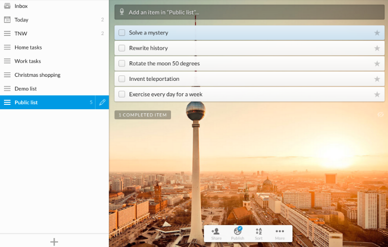 Paper is wasteful. Nonetheless, lists are a natural way to help keep things straight. I like the list app Wunderlist for its simplicity. I don’t need a ton of bells and whistles to jot stuff down. All I need is an app that syncs all my devices and can be accessed over the web so that I can keep tabs on and update important lists. Wunderlist allows me to do this seamlessly and with fast syncing. Its ease of use is why it's been my list app of choice for many years now. It's simple to add priority or reorder list items. I can even set reminders. But in all honesty, I tend to use it exactly as I would a note pad. Some lists I update very regularly, like Agenda items for our weekly partners meeting. Other tasks are more ongoing, without a specific deadline. I like using Wunderlist to keep track of these thought threads, making it a habit to check in on them when I have time.